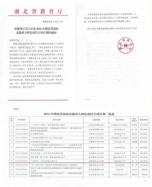 7月28日,省教育厅发文(鄂教思政函〔2016〕8号)公布2016年湖北省高校实践育人特色项目立项名单。由我院洪文老师主持的“‘创英荟’大学生创业人物寻访”项目,成功入选十大重点资助项目。