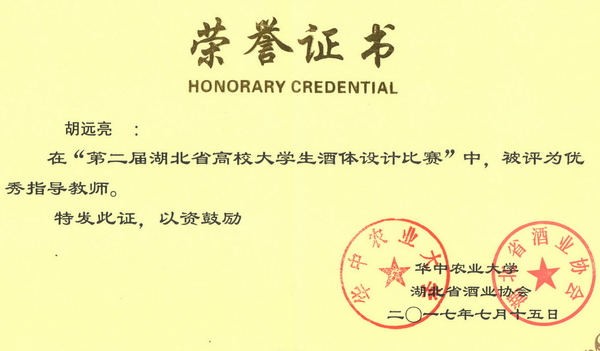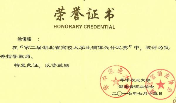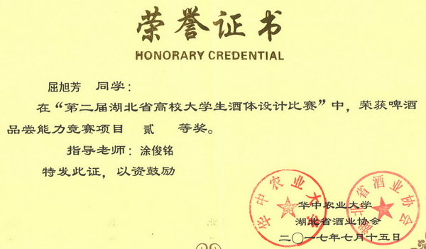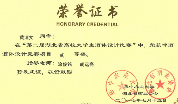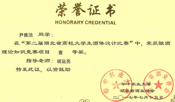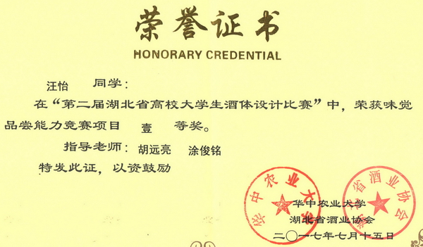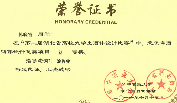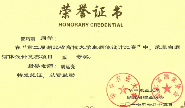 第二届湖北省高校大学生酒体设计大赛获奖证书