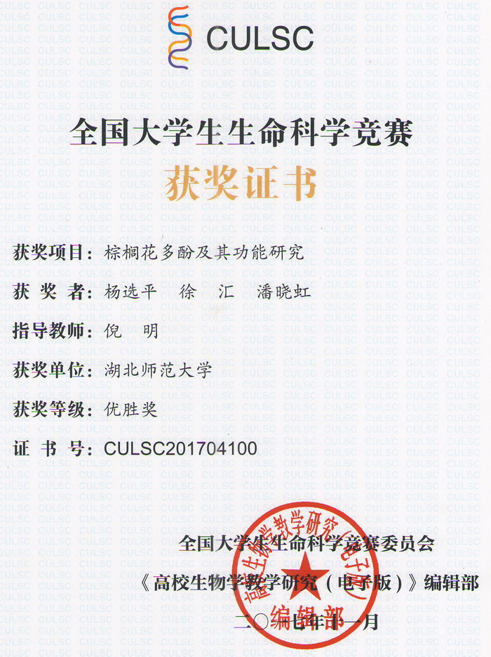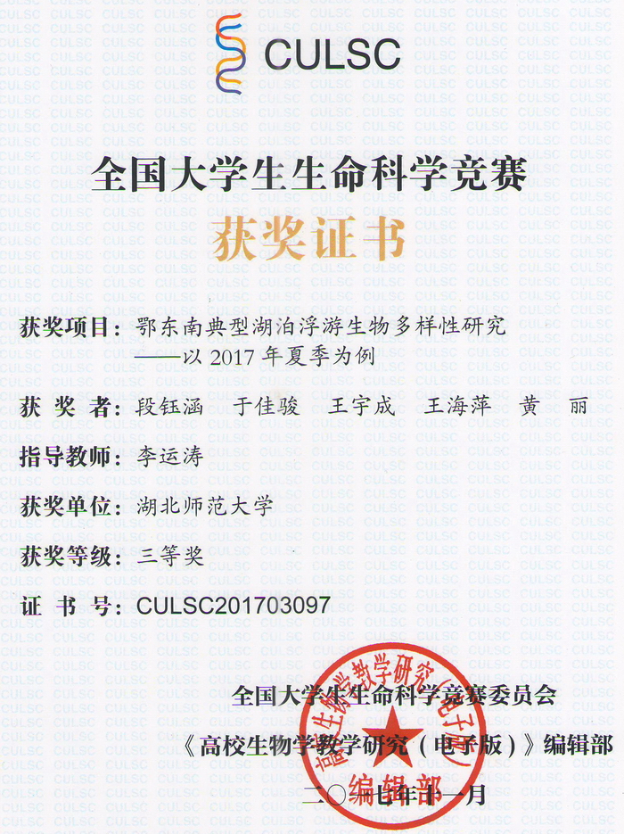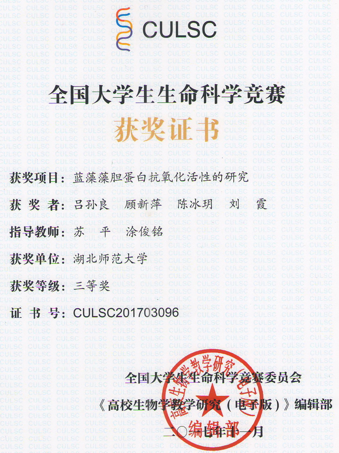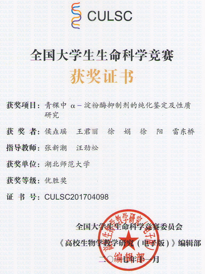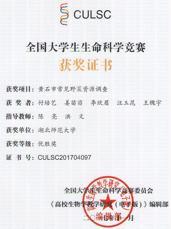 首届全国大学生生命科学竞赛获奖证书