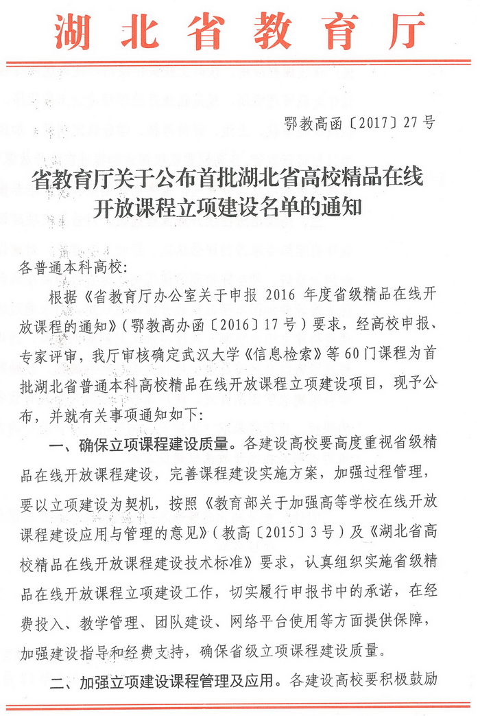 《生物学综合实验》获批为首批湖北省高校精品在线开放课程立项建设项目