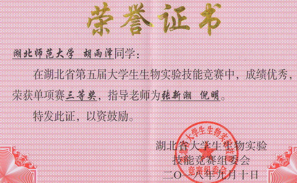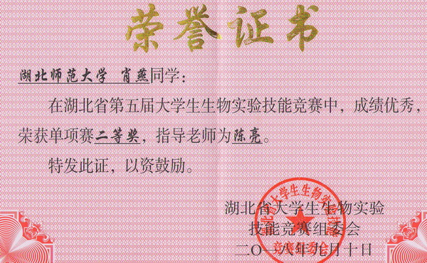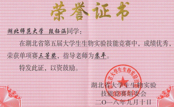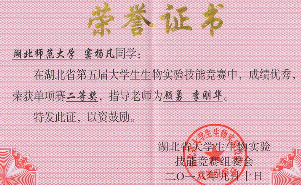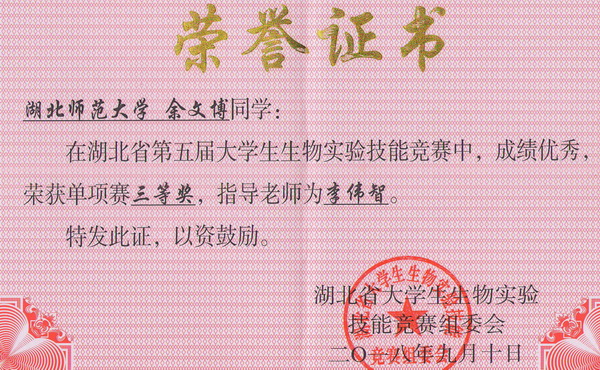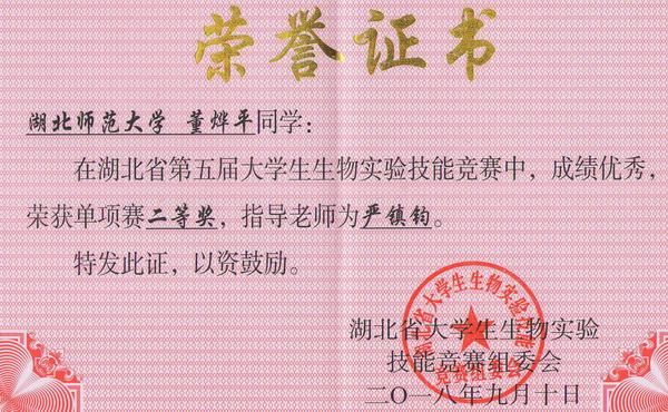 第五届湖北省大学生生物实验技能竞赛单项赛获奖证书