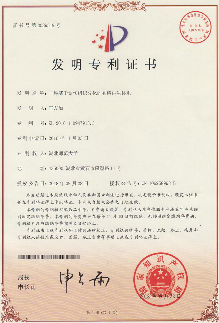王友如教授科研团队致力于优质野生菜用香椿种质资源的发掘与利用研究。近年来系统研究了外植体种类、培养基、激素种类和浓度、蔗糖浓度等影响香椿胚性愈伤组织诱导、分化、植株再生的因素,在香椿无性快速繁殖研究领域取得了阶段性成果,“一种基于愈伤组织分化的香椿再生体系”喜获国家授权发明专利。该专利为优质菜用香椿种苗工厂化生产研究提供了有力技术支撑。