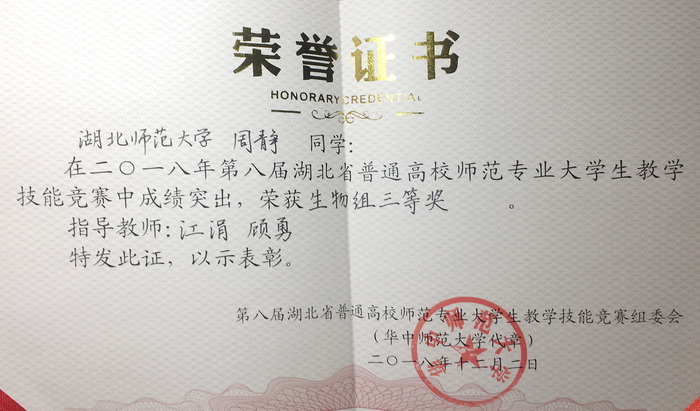 2018年12月1-2日,第八届湖北省普通高校师范专业大学生教学技能竞赛在华中师范大学举行,来自全省16所院校96名选手参赛。我院周静同学(指导老师为江涓、顾勇)获得生物组三等奖。