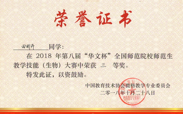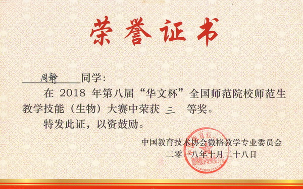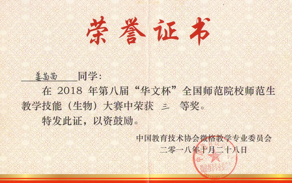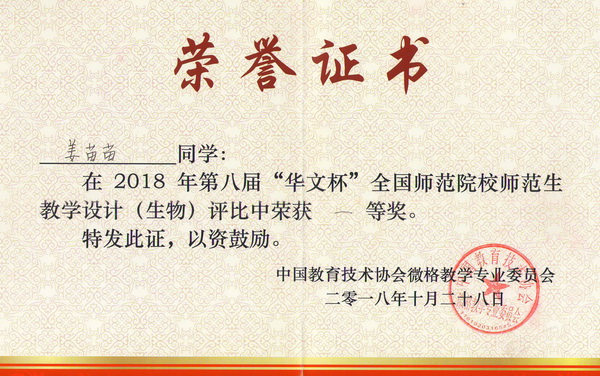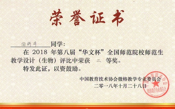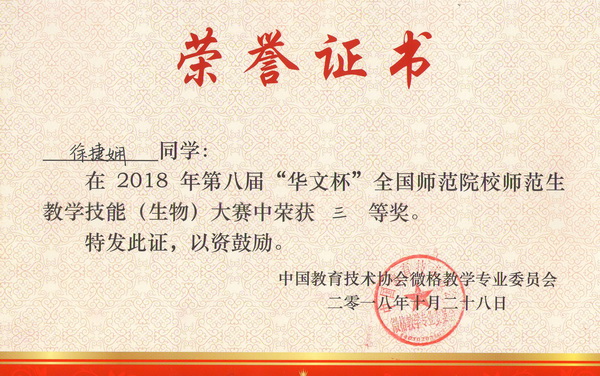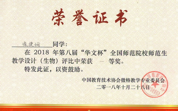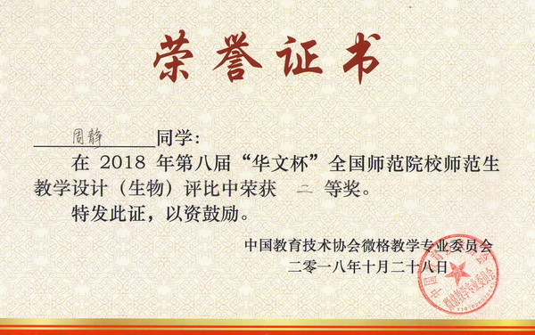我院参赛选手获得教学设计评比一等奖2项、二等奖2项和教学技能大赛三等奖4项。2018年10月27日至28日,由中国教育技术协会微格教学专业委员会主办,南京晓庄学院承办的中国教育技术协会微格教学专业委员会第二十一届年会暨第八届“华文杯”全国师范院校师范生教学技能大赛在江苏省南京市举行。来自北京师范大学、华中师范大学、南京师范大学、湖南师范大学和我校等全国106所高校的628名选手参加了本届大赛,其中生物学科参赛选手349名。