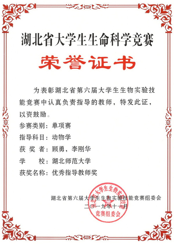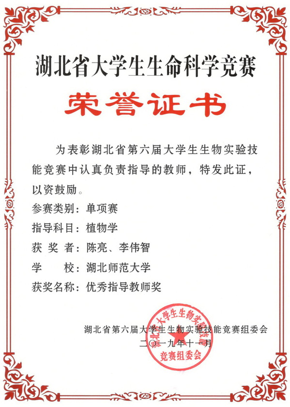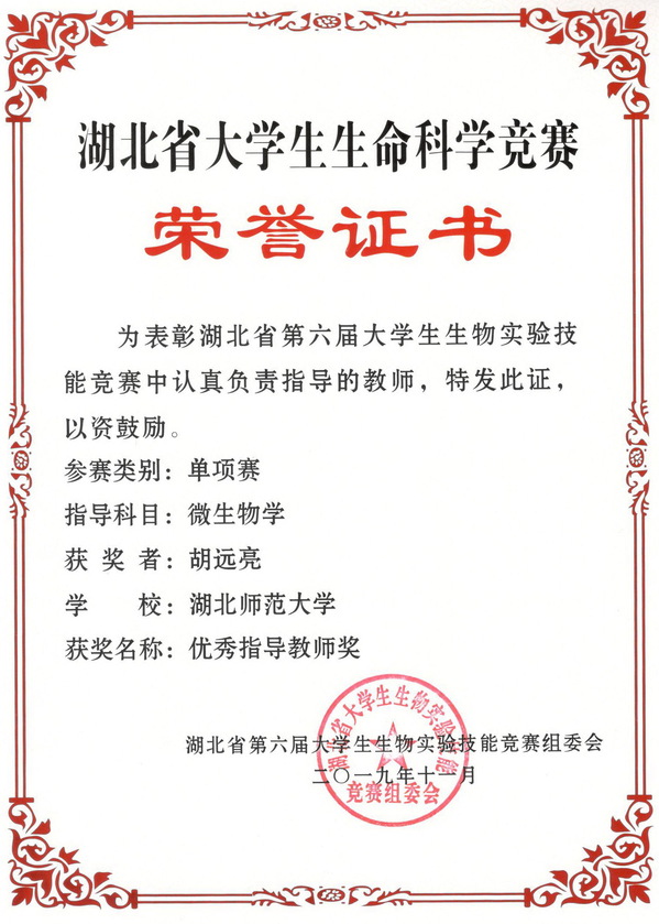 2019湖北省大学生生命科学竞赛单项赛获奖证书(指导教师)