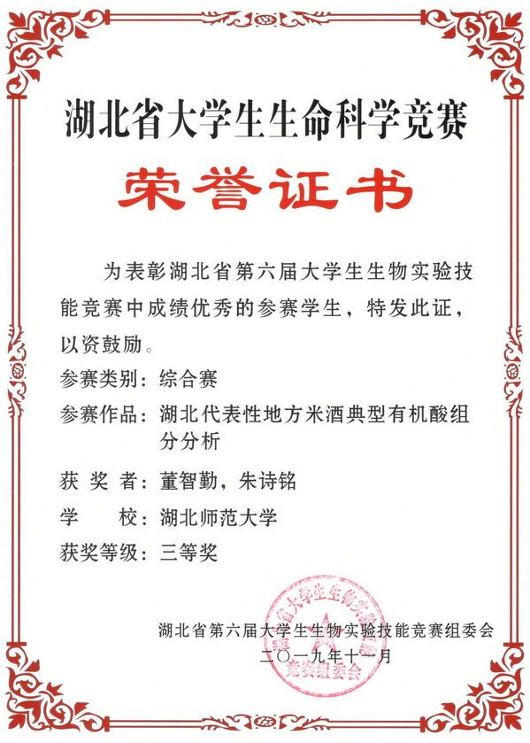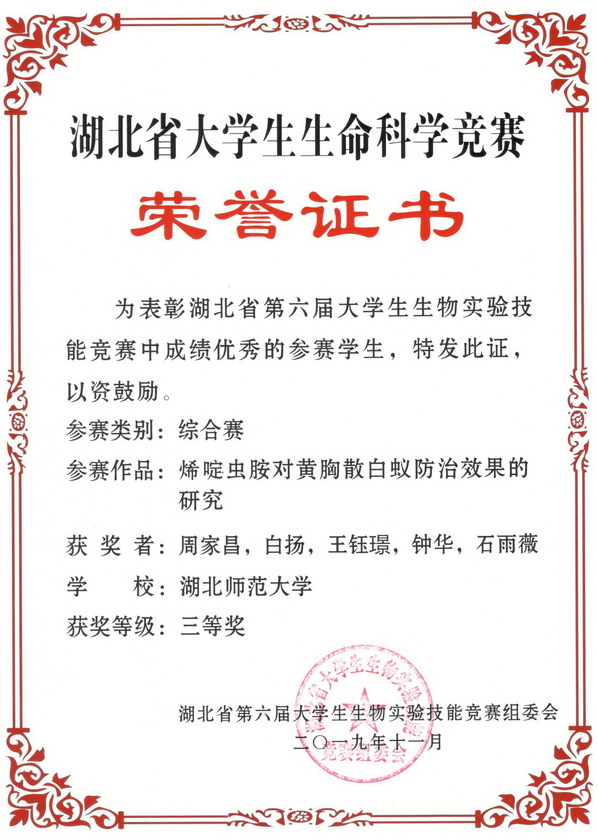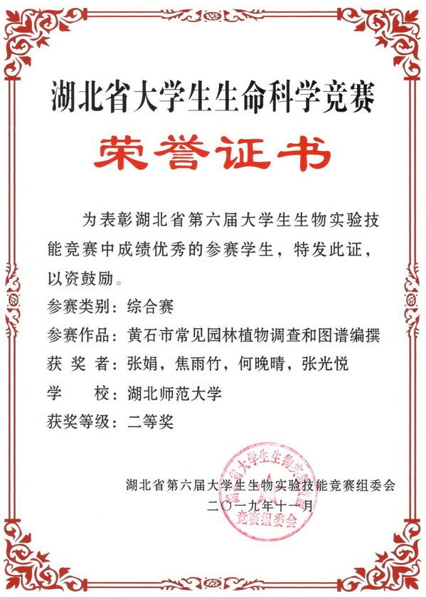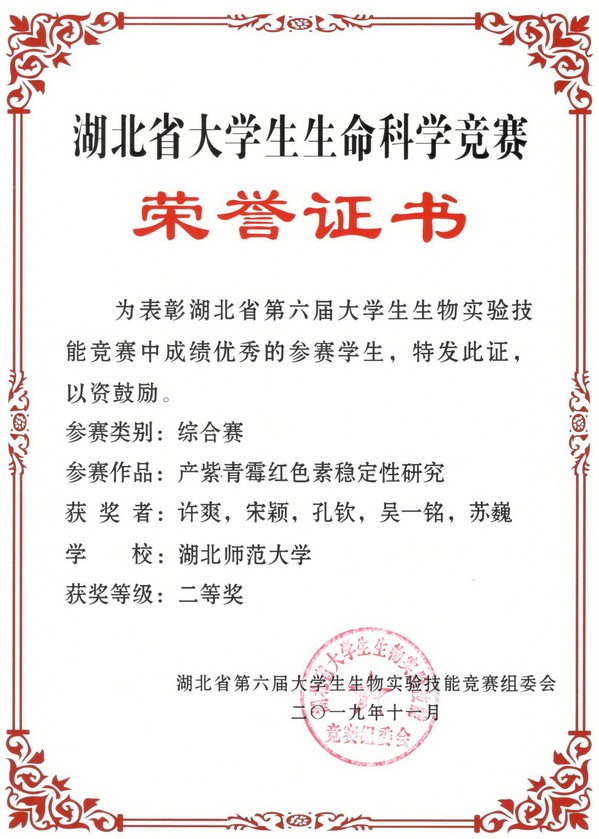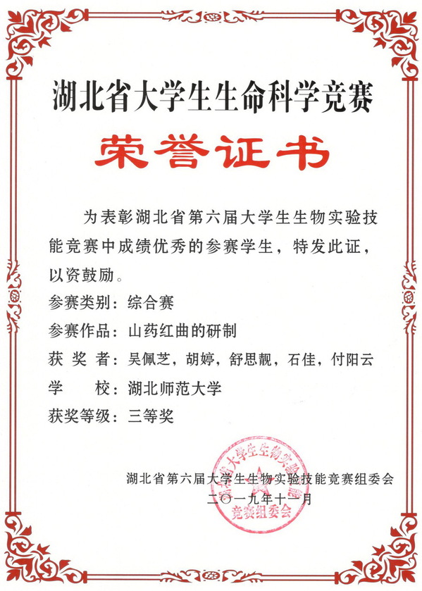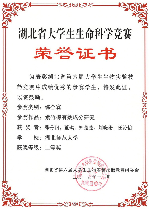 2019湖北省大学生生命科学竞赛综合赛获奖证书(学生)