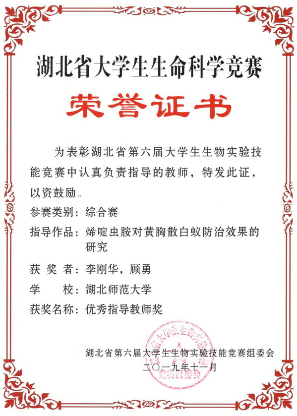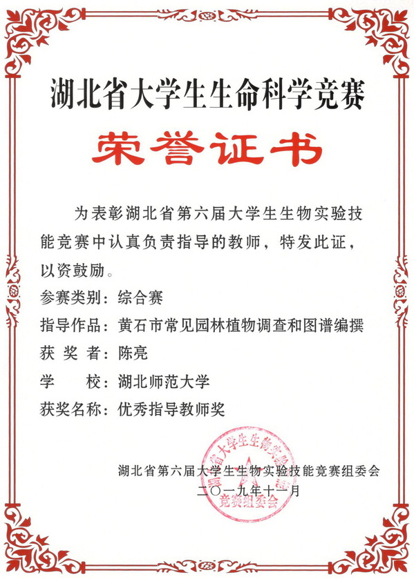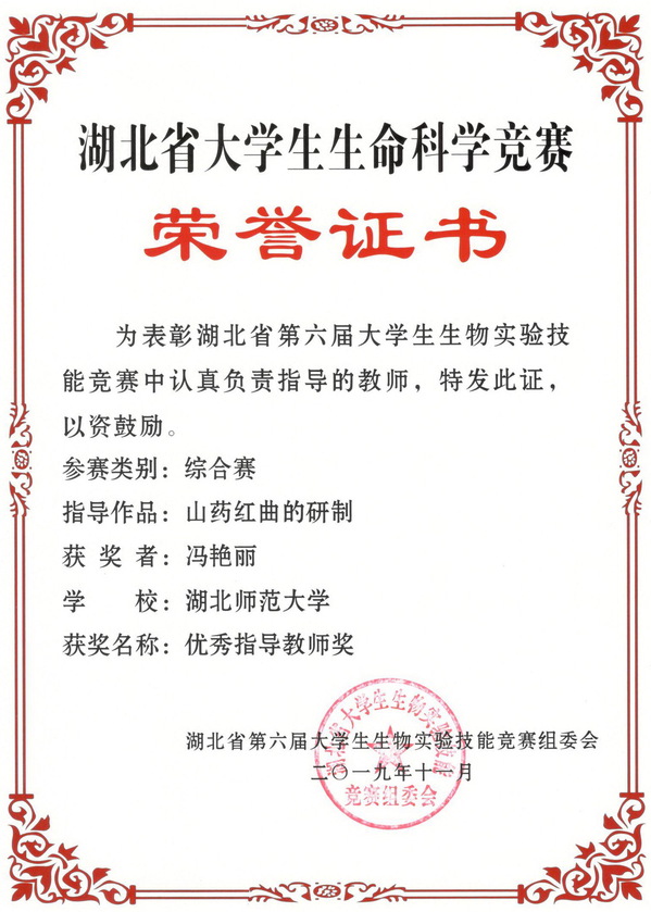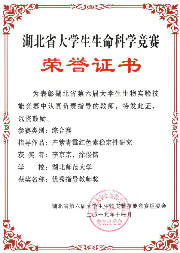 2019湖北省大学生生命科学竞赛综合赛获奖证书(指导教师)