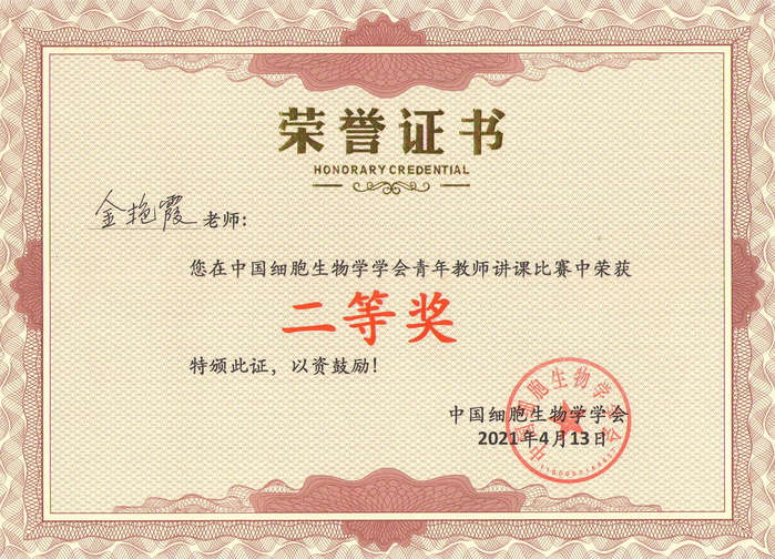2021年中国细胞生物学学会青年教师讲课比赛获奖证书