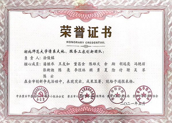 情系大地服务三农创新团队荣誉证书