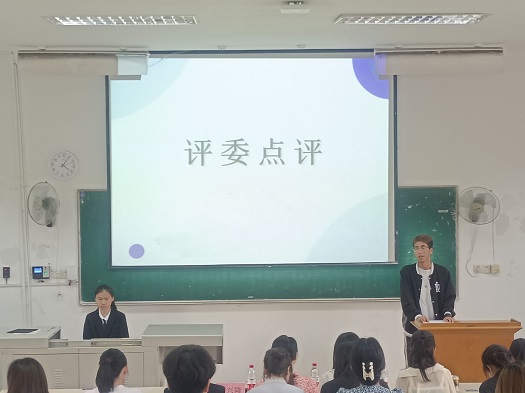 会议伊始,主持人介绍本场比赛规则和评分标准。参赛选手依次上台演讲。其中,外院、化院、音院的选手借助PPT、演唱的方式来展示自己的专业;而城环、计信、生科院、美院通过原创音视频来展示自己专业的特色,他们声音洪亮,就自己所热爱的专业侃侃而谈。所有选手演讲完毕,由靳兴隆同学和秦晓碟同学进行总结点评,首先表扬了同学们敢于站上讲台的勇气和新颖的演讲题材,演讲方式也让人眼前一亮。同时指出选手存在衣着不够正式,在讲台上不断走动的问题。并以英国威廉集团为例子,建议选材不要单单拘泥于专业课课程。同时,要融入思政育人亮点。最后,公布比赛结果。