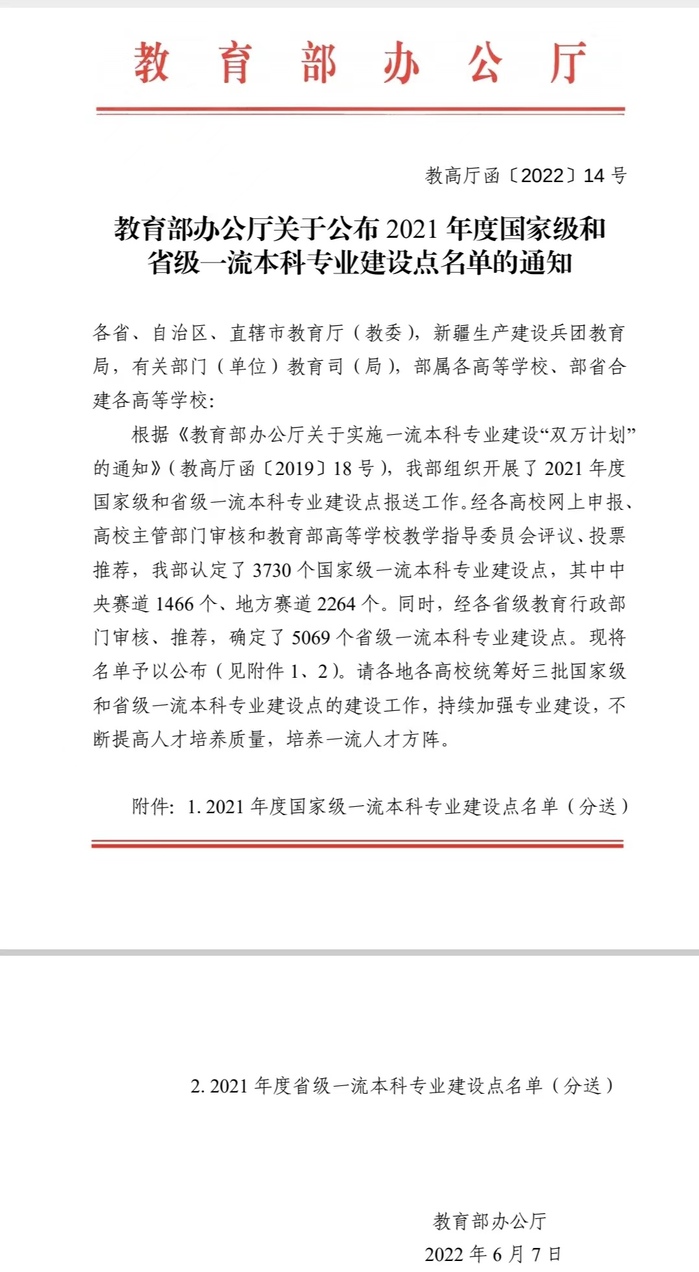 近日,教育部办公厅印发了《关于公布2021年度国家级和省级一流本科专业建设点名单的通知》(教高厅函〔2022〕14号),我院生物技术专业入选2021年度国家级一流本科专业建设点,食品科学与工程术专业入选2021年度湖北省一流本科专业建设点。