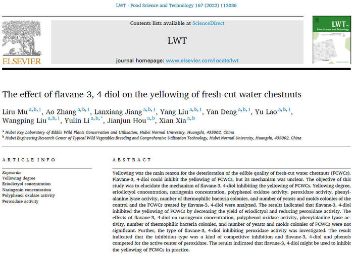 近日,李煜林博士团队在《LWT-Food Science and Technology》(JCR1区,IF:6.056)上发表题为“The effect of flavane-3, 4-diol on the yellowing of fresh-cut water chestnuts”的研究论文。通讯作者为李煜林,其团队的穆丽如、张奥、蒋兰香、刘洋、邓艳、劳玉、刘望平等7名本科生为共同第一作者。