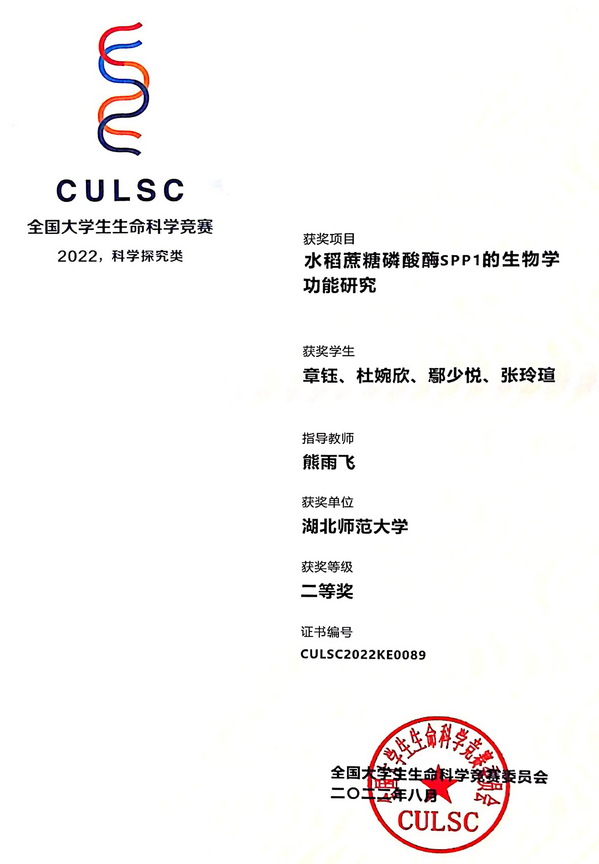 熊雨飞博士指导的《水稻蔗糖磷酸酶SPP1的生物学功能研究》项目(团队成员:章钰、杜婉欣、鄢少悦、张玲瑄)荣获全国大学生生命科学竞赛(2022,科学探究类)二等奖。