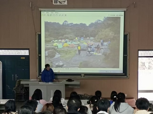 本次课程分为理论教学和实践操作两个环节。张良老师在8J21开展理论教学部分,首先他用PPT进行了一个有趣的自我介绍,活跃了课堂气氛。随后他向同学们放映各地野外露营的照片,借此向同学们讲解如何进行野外营地的选择和帐篷搭建的具体理论知识,最后展示野外露营的工具同时向同学们介绍使用方法以及注意事项。