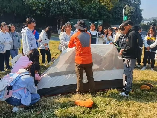 本次课程的实践操作部分在大数据与自动化实训中心前的草坪开展。张良老师以能独立搭建帐篷作为本次课程实操成果。他首先向同学们讲解帐篷搭建的步骤,随后同学们纷纷上手,在张良老师的指导下搭建骨架、绳系布幕、敲定地钉……一个完整的帐篷在师生的共同合作下成功搭建。