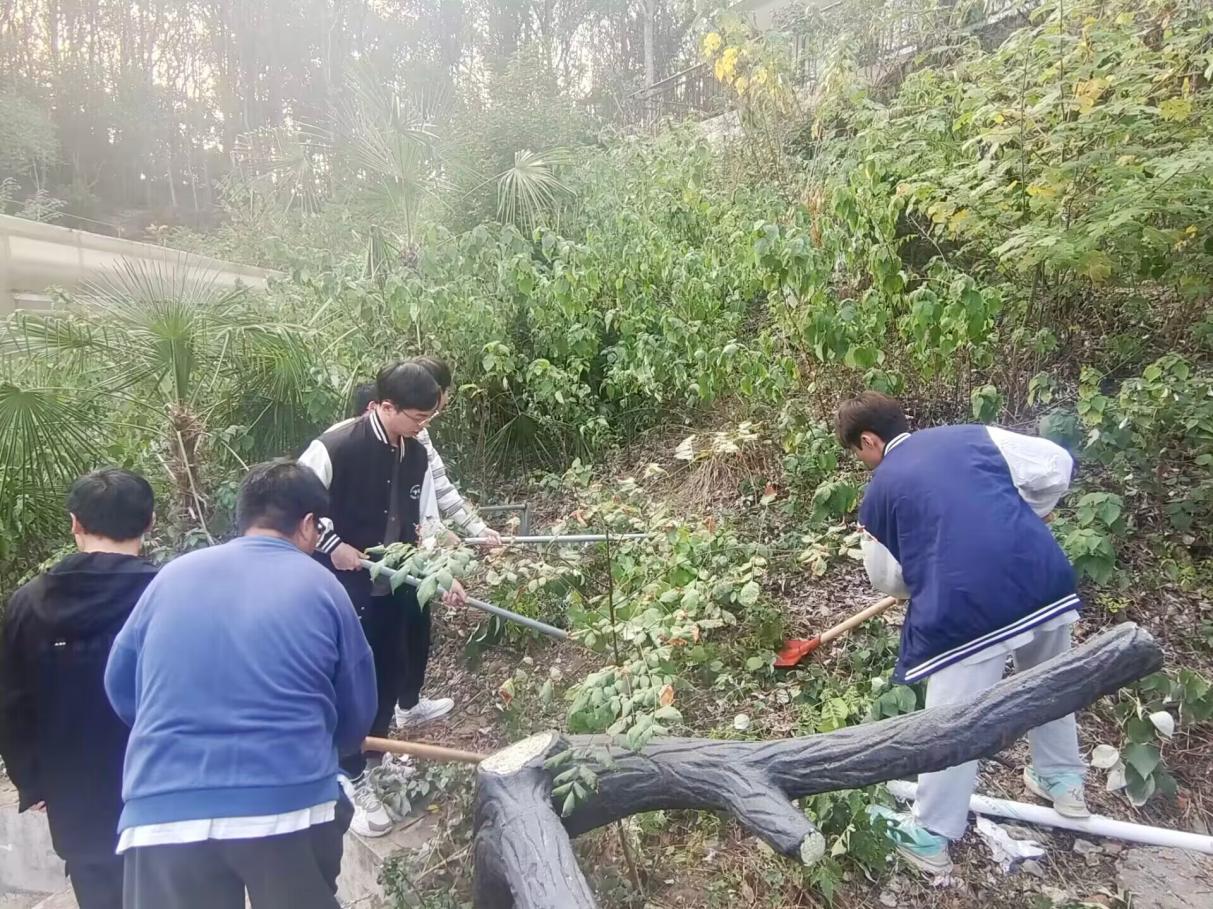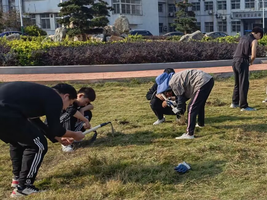 在草地清理过程中,同学们分为两组,一组除草,一组将杂草装入垃圾袋。同学们埋头苦干,搭配干活,从劳动中收获快乐,从辛苦中感悟生活。