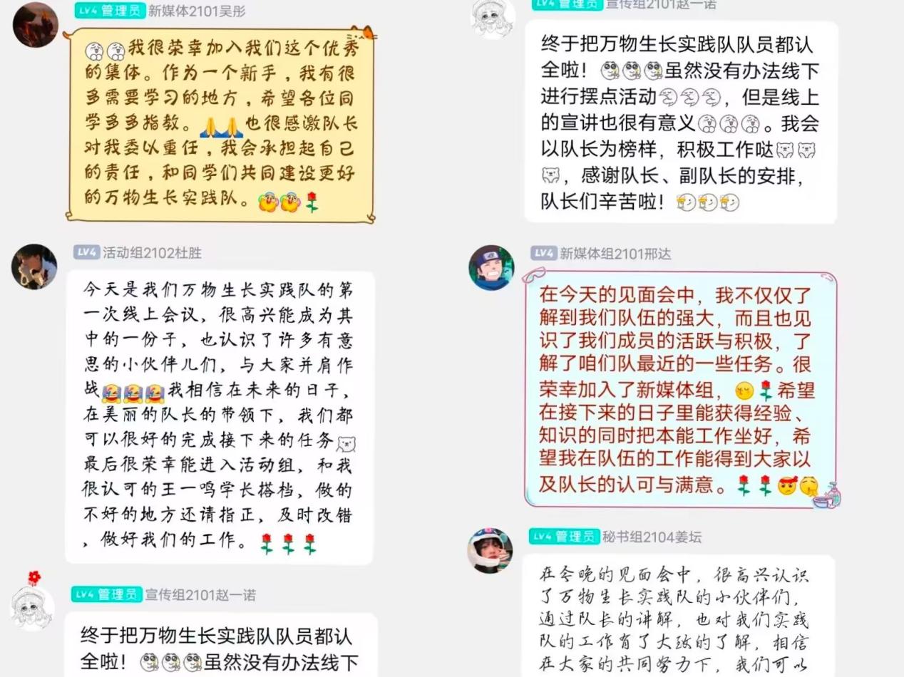 会议伊始,万物生长实践队各成员依次进行自我介绍,增强了对彼此的了解,活跃会议氛围。然后由队长马静莹说明成员的分组情况,初步介绍各组的工作和责任。之后队长马静莹讲解了各小组的任务以及此次万物生长实践队社会调研的详细活动流程,并就出题方向提出了建议,同时为各组下发了近期的工作安排。会议结束后,队员们在群中纷纷发表对于此次见面会的感想,以及对未来的无限展望,
