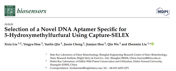 刘细霞博士团队,在核酸适配体筛选研究方面积累了多年的经验。本研究通过构建固定文库的Capture-SELEX技术,经过18轮筛选后,发现文库得到富集。再经高通量测序,发现4个家族中各自序列的同源率超过90%。从中挑选5条序列,ITC鉴定发现有3个家族序列均对5-HMF有高特异性。经二级结构分析和序列突变分析,发现H1家族中有关键结合阈。建立猝灭型传感器,可用于奶粉中5-HMF的残留监测。本研究结果为5-HMF的快速监测方法开发提供核心识别分子,并为乳品风险监测提供新思路。