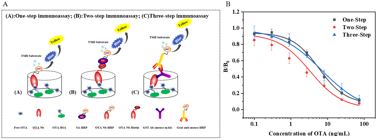 赭曲霉毒素A (Ochratoxin A, OTA)是曲霉和青霉产生的次生代谢物,具有肾毒性、肝毒性、致畸、致癌、致突变和免疫抑制等毒性作用。OTA广泛存在于各种谷物、香料、中药及其制品中。2017年,世界卫生组织国际癌症研究机构将OTA确定为2B类致癌物。因此,对OTA检测方法的研究引发了广泛的关注。纳米抗体具有分子量小、亲和力高、稳定性强、易修饰等天然优势,是近年来被广泛研究的一种新型抗体。本文重点开展了以下三方面:(1)密码子优化的OTA纳米抗体-GST融合蛋白的可溶性表达和纯化;(2)基于OTA纳米抗体-GST融合蛋白建立的一步法免疫分析的时间仅为15 min;(3)谷物样品仅经过简单的提取可直接检测。本研究成果有望开发成商业化快检试剂盒。