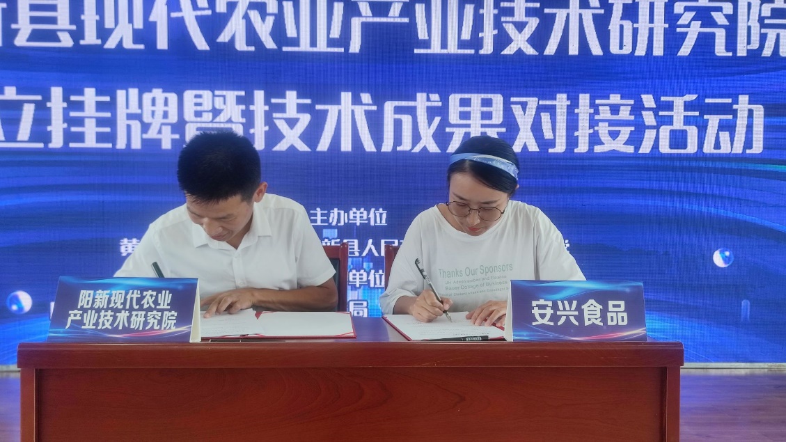 挂牌仪式第二阶段,我校生科院涂俊铭教授、王友如教授、余翔副教授和刘焕博士分别将所在研究团队的研发成果进行路演,并现场解答相关企业的技术咨询。胡远亮代表研究院与安兴食品、阳新县农发公司、祥云粮油公司签订技术合作协议。