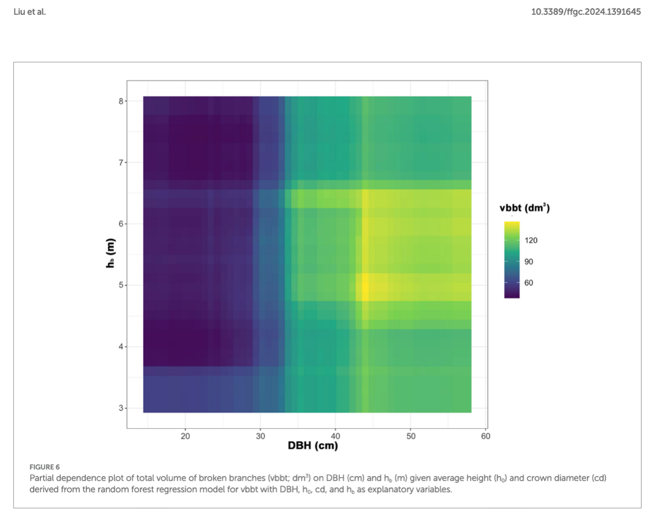 本网讯(通讯员 徐坤)我院教师指导2022级本科生刘依晨、2021级本科生张钧茹、2023级本科生饶杉杉发表题为《Sleet damage to branches and crowns of street camphor trees (Cinnamomum camphora) in a central China mega-city: damage statistics, modelling, and implications》的本科生第一作者SCI期刊论文。该论文于2024年10月15日刊发在《Frontiers in Forests and Global Change》杂志,本科生刘依晨为第一作者,通讯作者徐坤,论文研究了2024年2月湖北省大范围冻雨过程中樟树枝干和树冠受冻雨侵害程度同樟树胸径、树冠直径、树高和枝下高的关系,并对此次冻雨侵害情况做出了估计。(审核 邵海晨)