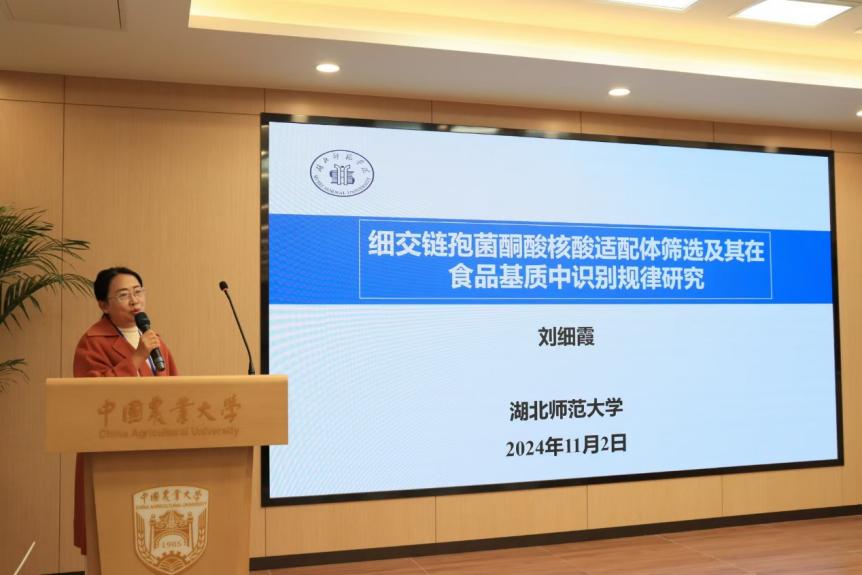 刘细霞副教授以“识别细交链孢菌酮酸核酸适配体筛选及其在食品基质中识别规律研究”为主题,介绍了她在食品质量等方面的研究成果。她提到,通过筛选针对小分子危害物的核酸适配体,能够实现对食品中有害物质的快速、准确检测,为保障食品安全提供了有力的技术支撑。她的研究成果在食品安全领域具有重要意义,对适配体在食品基质受影响的机制取得了进展,并获得了与会者的高度评价。