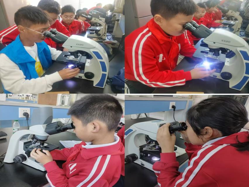 接下来,学生们来到了微生物实验室,在志愿者的指导下,孩子们亲自操作显微镜:把标本放在在舞台上,调节光源,转动粗准焦螺旋……一系列操作后,孩子们观察到了小麦根、茎、叶的细胞结构。“原来小麦茎的细胞长这样啊”“太棒了!终于看到了”孩子们发出一阵阵惊叹,脸上的惊喜溢于言表。通过亲自操作显微镜,孩子们感受到了微观世界的奇妙,并极大地提高了他们的观察力和动手能力。