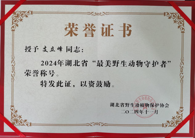 据悉,湖北省“最美野生动物守护者”由湖北省野生动植物保护协会发起,旨在挖掘全省保护野生动物的先进典型,在全社会形成“保护野生动物,人人有责”的社会风尚和强烈氛围,促进人与自然和谐共生。评选活动启动以来,许多基层林业部门、社会组织积极推荐身边保护野生动物的先进人物。经评审委员会认真评选,最终10名同志被评为2024年湖北省“最美野生动物守护者”荣誉称号。