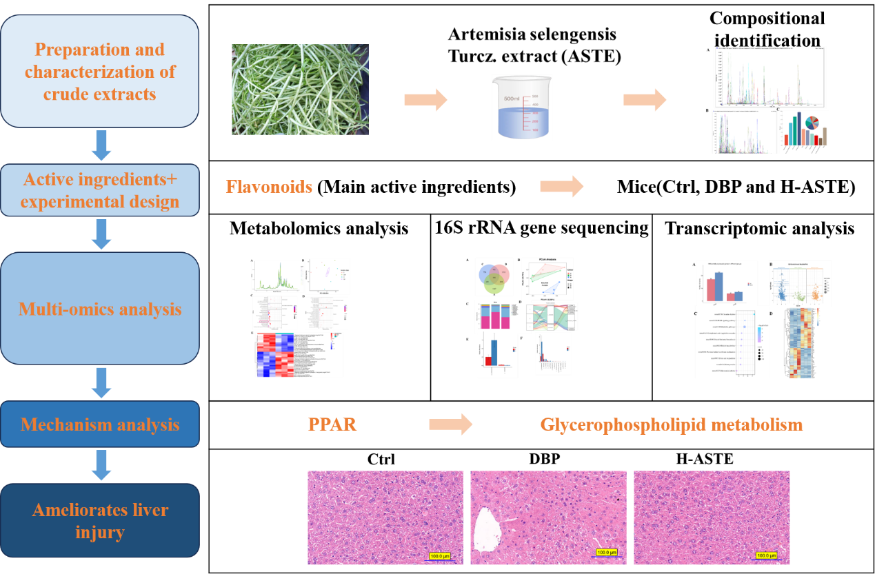本研究旨在评估藜蒿 50%乙醇提取物(ASTE)在邻苯二甲酸二丁酯(DBP)所致小鼠肝损伤模型中的治疗潜力。通过多组学分析,包括转录组学、代谢组学和肠道菌群分析,我们探索了ASTE治疗肝损伤的关键途径和靶点。网络药理学进一步确定了 ASTE 治疗肝损伤的关键成分。我们的研究结果表明,ASTE 通过类黄酮,尤其是柚皮苷和表儿茶素,影响肠道菌群,如Adlercreutzia。此外,PPAR通路中的关键基因,如Fabp3、Fabp5、Ehhadh和Pltp,通过影响甘油磷脂代谢,从而改善肝损伤。这项研究揭示了 ASTE 具有保肝作用的分子机制,为其作为功能食品的潜在应用奠定了基础。