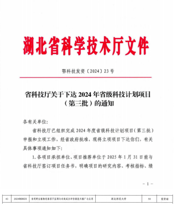 本网讯(通讯员 吴琴)近日,省科技厅正式下达了关于2024年中央引导地方科技发展资金项目的通知,其中,我院刘细霞教授负责申报的项目《食用野生植物危害因子监测与功效成分评价新技术推广与应用》成功获批立项,并获得50万元的技术创新计划资助。