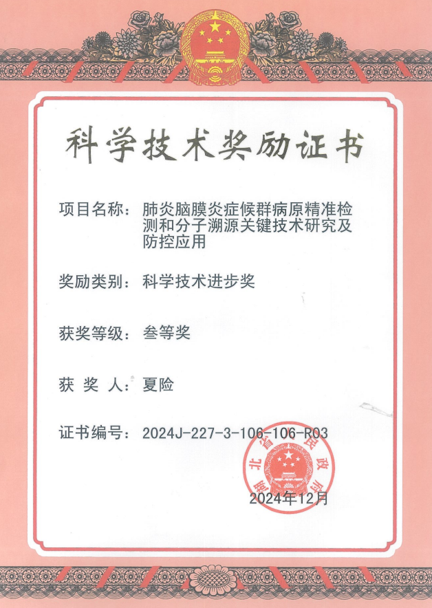 近日,湖北省召开湖北省科技创新大会在武汉举行。会上宣读了《湖北省人民政府关于2024年度湖北省科学技术奖励的决定》,共授予337项(人)科学技术奖励。我院夏险副教授与国家疾病预防控制中心、湖北省疾病预防控制中心等单位联合申报的项目《肺炎和脑膜炎症候群病原精准检测和分子溯源关键技术研究及防控应用》获得湖北省科技进步奖三等奖。