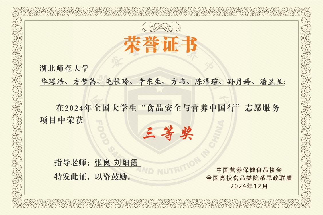 本网讯(通讯员 张良)近日,2024年全国大学生“食品安全与营养中国行”志愿服务项目奖项揭晓,该项目由中国营养保健食品协会及教育部食品科学与工程类教学指导委员会联合指导。经过全国范围内上百所高校的激烈竞争,william威廉英国的“食韵康程”实践队脱颖而出,荣获三等奖。