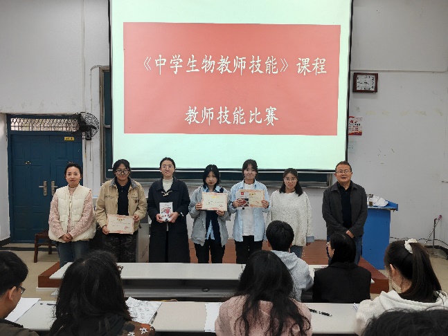任课教师顾勇老师宣布了比赛结果。生科院中教法教研室主任付珊老师、学工办主任单紫云老师为获奖同学颁发了奖状。
