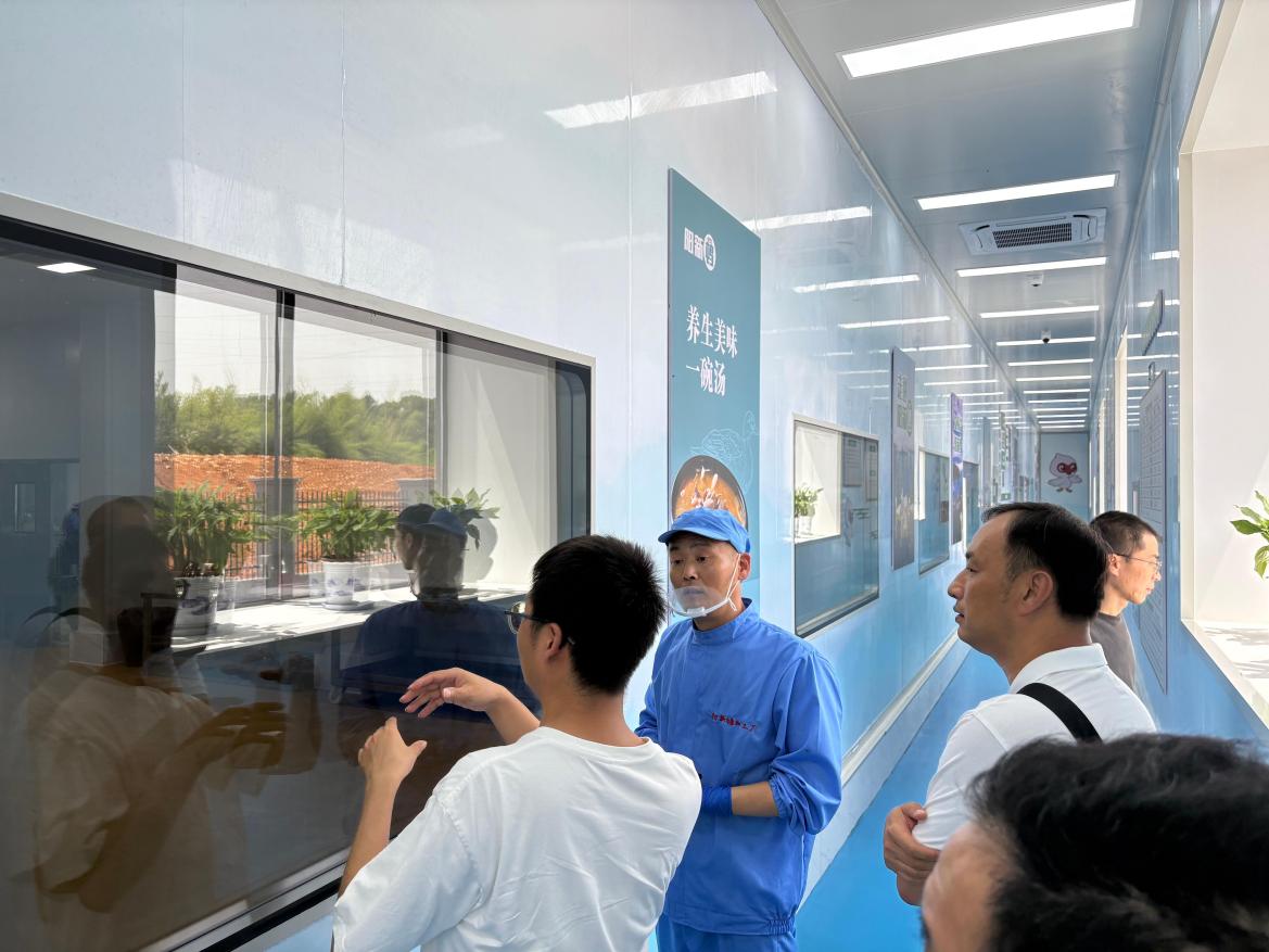 调研组最后一站来到了位于军垦园区的屯鸟加工厂。在参观了标准化的流水线加工车间时,双方对储藏、灭菌和灌装等工序交换了不少经验。针对产品线的开发,余翔院长在屯鸟卤制品及便携自加热罐汤方面提出了一些建设性意见。