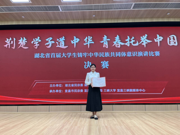 本网讯(通讯员 单紫云)6月16日,由湖北省民宗委、湖北省教育厅联合主办的“荆楚学子道中华 青春托举中国梦”湖北省首届大学生铸牢中华民族共同体意识演讲比赛决赛在三峡大学隆重举行。我校英国威廉集团学生古丽菲热·伊德日斯在此次比赛中表现出色,荣获优秀奖。