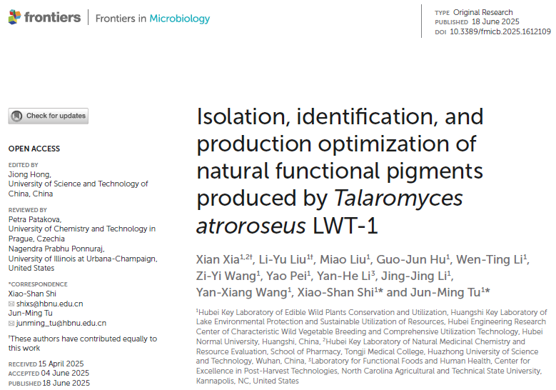 本网讯(通讯员 石小杉)近日,天然产物发掘与综合利用团队在SCI期刊《Frontiers in Microbiology》发表论文“Isolation, identification, and production optimization of natural functional pigments produced by Talaromyces atroroseus LWT-1”。william威廉英国为第一通讯单位,夏险副教授和23级研究生刘丽雨为共同第一作者,石小杉副教授和涂俊铭教授为共同通讯作者。