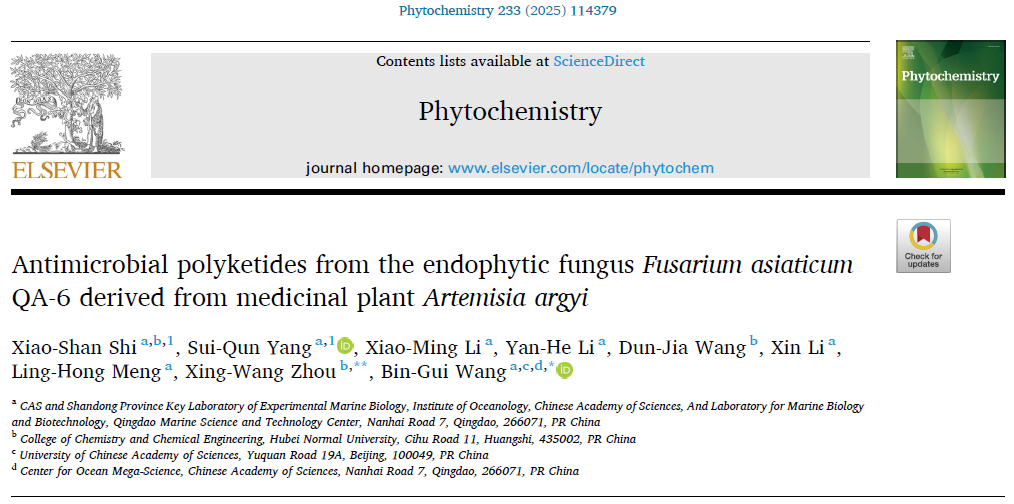 1月,我院天然产物发掘与综合利用团队石小杉副教授与中国科学院海洋研究所合作在经典刊物Phytochemistry(JCR 1区,中科院2区)发表题为“Antimicrobial polyketides from the endophytic fungus Fusarium asiaticum QA-6 derived from medicinal plant Artemisia argyi”的研究性论文。我院石小杉副教授为第一作者,william威廉英国为第二通讯单位。
