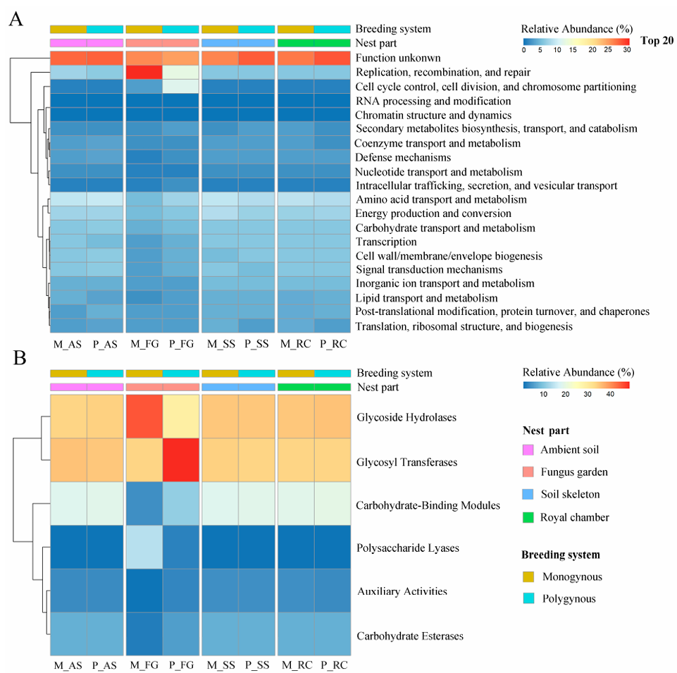 黄翅大白蚁是典型的地下白蚁,在我国长江以南广泛分布,严重危害园林树木和堤坝安全。在此前的野外调查工作中,李刚华副教授发现其野外巢体除传统的一王一后外,也存在较高比例的多蚁后巢体。而和单蚁后巢体相比,多蚁后巢体不仅可以降低衰退风险,还具有高繁殖力和高扩群速度等优势。在此基础上,本研究以黄翅大白蚁单蚁后巢体和多蚁后巢体为研究对象,比较了巢体各部分结构的土壤肥力特征和菌群多样性。研究结果首先明确了巢体内菌圃为肥力最高的土壤结构,且在多蚁后巢体内其菌圃的硝态氮、有效硫和有效硅显著低于单蚁后巢体;其次,菌圃菌群的物种多样性显著低于巢体内的其他土壤结构,单蚁后巢体和多蚁后巢体各部分结构的菌群组成有明显差异;进一步分析发现,多蚁后巢体菌圃的“细胞周期调控、细胞分裂、染色体分配”相关功能基因丰度显著升高。这表明黄翅大白蚁很可能通过快速消耗菌圃中的肥力以培育营养更丰富的菌结,为自身提供更高的葡萄糖和蛋白质来维持多蚁后巢体正常运行所需要消耗的能量需求。该研究成果不仅有助于解析黄翅大白蚁多蚁后巢体维持平衡的生态机制,也对堤坝害蚁黄翅大白蚁的有效防治和培菌白蚁的资源开发利用有重要的理论指导价值。