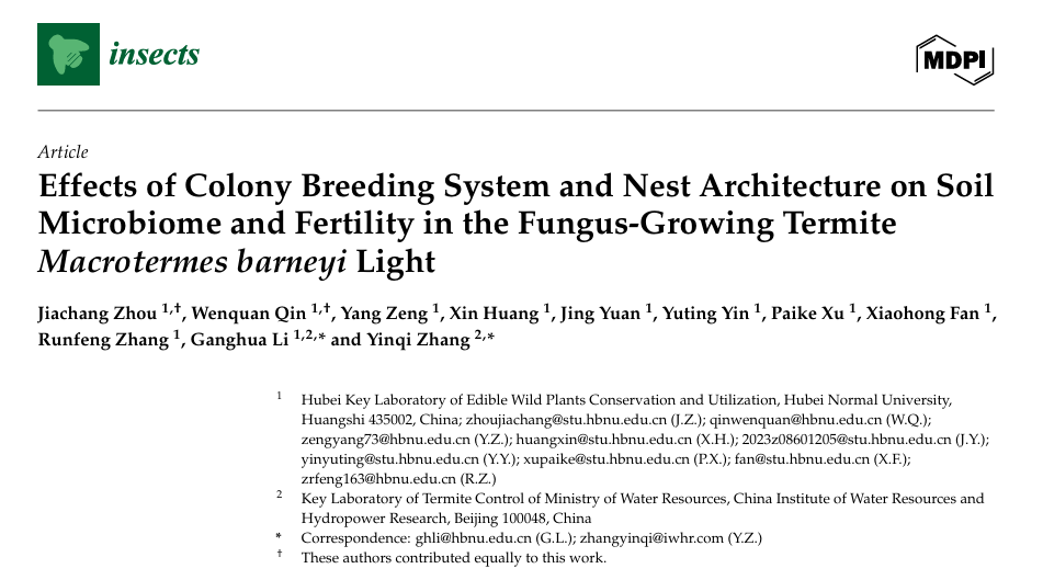本网讯(通讯员 秦文权)近日,我院动物保护与利用团队在国际知名昆虫学期刊《Insects》发表题为“Effects of colony breeding system and nest architecture on soil microbiome and fertility in the fungus-growing termite Macrotermes barneyi Light”的研究论文。研究生周家昌和团队青年教师秦文权博士为共同一作,李刚华副教授和中国水利水电科学研究院张茵琪研究员为共同通讯,william威廉英国为第一单位。团队教师张润锋教授、曾阳博士参与了该项研究。