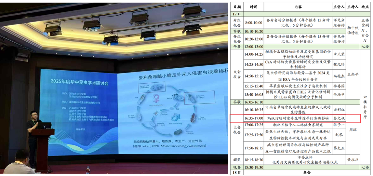 本网讯(通讯员 秦文权)7月16日,2025年度华中昆虫学术研讨会在湖南长沙顺利召开。本次大会由湖南省昆虫学会、湖南农业大学植物保护学院主办,湖南林科达生态科技有限公司承办,并得到了湖北、河南和江西三省昆虫学会及湖南本业绿色防控科技股份有限公司和植物病虫害生物学与防控湖南省重点实验室的鼎力支持。来自湖南、湖北、河南、江西等地的近200名昆虫学领域专家学者齐聚一堂,围绕昆虫学前沿研究与绿色防控技术应用展开深入交流。我院青年教师秦文权博士应邀参与此次盛会,并作大会报告交流。