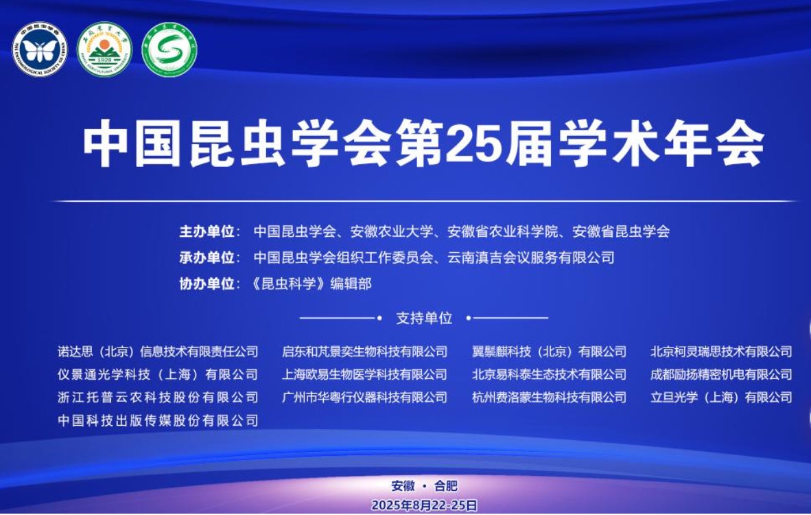 本网讯(通讯员 李刚华)2025年8月22日至25日,中国昆虫学会第25届学术年会在安徽省合肥市安徽世纪金源大饭店成功召开。来自全国高校、科研院所与企业的1000余名专家学者、会员代表参会,会议特邀了康乐院士、吴孔明院士、宋宝安院士、张克勤院士等12位行业顶尖专家做大会报告,还设置了7个学科组共167场报告和7场平行论坛等多形式交流环节,同步开展2025年度学会重要荣誉表彰与党建学习活动。本届年会由中国昆虫学会、安徽农业大学、安徽省农业科学院和安徽省昆虫学会联合主办,《昆虫科学》编辑部协办,中国昆虫学会组织工作委员会和云南滇吉会议服务有限公司承办,会议以“示踪昆虫学前沿 助力创新发展”为主题,坚持学术主旨、学者主角,倡导求真、求实、求是学风,紧扣主题,交流新理论、新观点、新学说、探讨新领域,推动我国昆虫学科高质量发展。