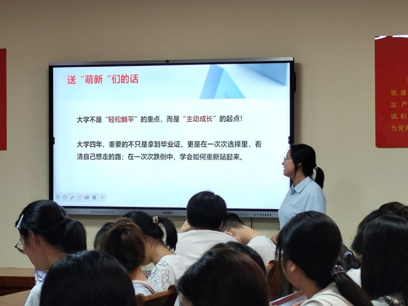 杨旭琼老师则以“学涯规划”为主题,与新生共话成长方向。她从入学适应难题切入,分享熟悉校园环境、合理规划作息的技巧;谈及社团选择,她建议新生结合兴趣与专业,避免盲目跟风,鼓励通过学术类社团提升能力;在人际关系搭建上,她强调真诚沟通,建议多与老师、学长学姐交流。此外,她引导新生分阶段规划学业:大一打基础、大二参与科研、大三明确考研或就业方向,并针对焦虑情绪分享调节方法,推荐学校心理咨询中心预约渠道。
