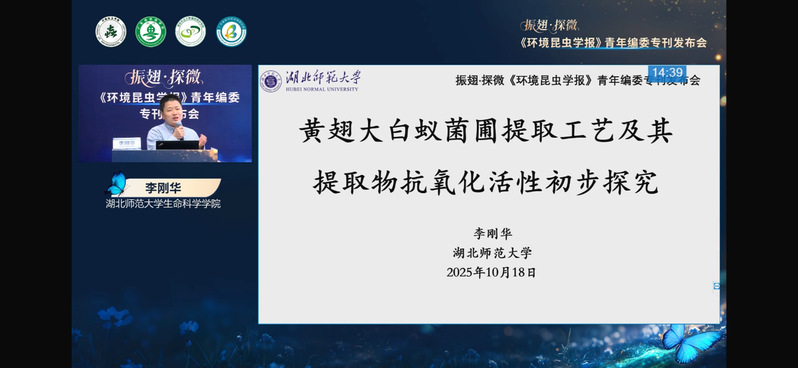 在会议现场,李刚华凭借其在昆虫研究领域深厚的学术积累和丰富的实践经验,聚焦黄翅大白蚁菌圃提取工艺及提取物抗氧化活性展开深入探讨。他系统介绍了黄翅大白蚁菌闻提取过程中的关键技术要点,包括提取方法选择、提取时间、提取功率等工艺参数优化方法,并通过实验数据详细分析了提取物的抗氧化活性指标及潜在应用价值。会议于10月18日在南京农业大学植物保护学院21栋114会议室进行特邀编委报告与青年编委专刊发布会环节,并通过微信、微博、小红书、抖音、b站5大平台同步直播,其分享内容兼具学术深度与应用前景,引发了线上线下参会人员的广泛关注和热烈讨论,大家纷纷表示受益匪浅,为今后的昆虫资源利用研究提供了新的思路和方向。
