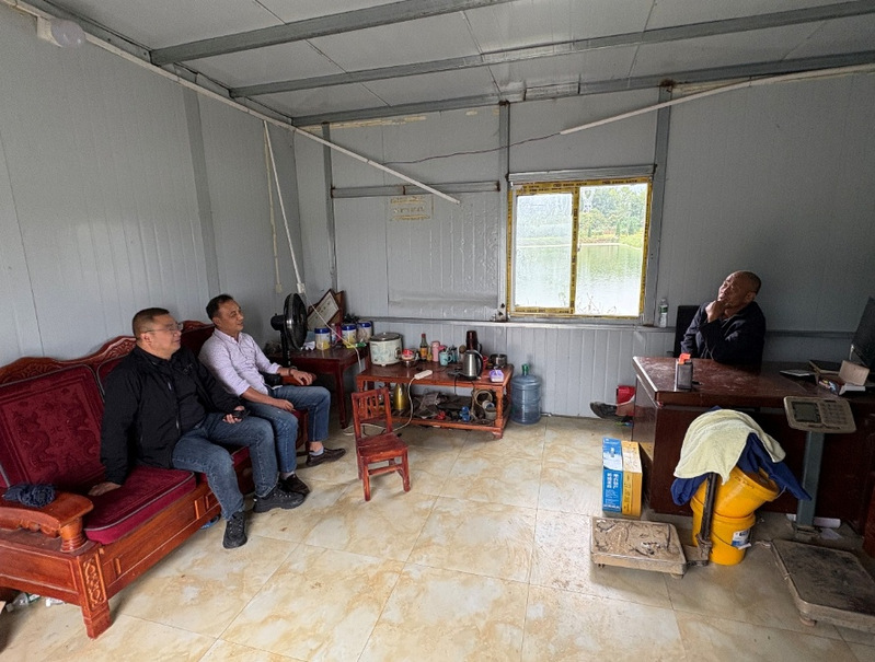 服务团队首站抵达陶港镇水产养殖大户贾希强的鳜鱼养殖基地。实地查看养殖水体环境和养殖设施布局后,专家组与养殖户进行了面对面交流,详细了解了鱼苗品种、养殖密度、投喂管理、病害防治以及经济效益等情况,并就饲料鳜在阳新本地的引种可行性展开了深入探讨。当了解到养殖户面临饵料鳜养殖密度高但收益不佳的难题时,黄昊结合多年实践经验与生态养殖理念指出,饵料鳜高密度养殖容易引发水体富营养化、病害风险增大、饵料系数升高等问题。他充分考虑本地养殖塘租价格低廉的优势,建议养殖户适当降低养殖密度,同时配套水质调控、科学投喂等措施,在保障生态环境稳定的基础上提升饵料鳜品质与综合效益,该建议获得了养殖户的认可与采纳。