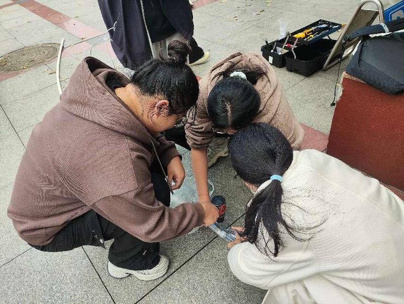 “知识要转化为生产力!”辅导员张良老师笑着举起PVC管和电钻,指导学生分组制作采摘工具。同学们巧妙运用饮料瓶制作摘果器,用铁丝和钉子固定在PVC管和木棍上,在瓶子中剪成三角形作为切割器。这些由废弃材料改造的采摘器,既贯彻了环保理念,更展现了工程思维与劳动智慧的碰撞。