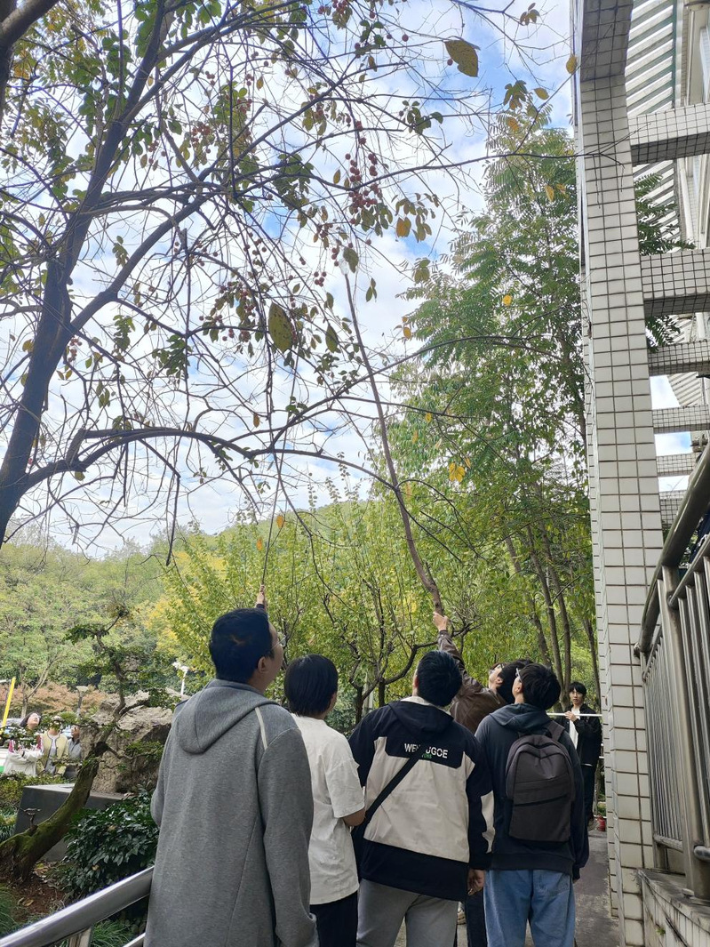 随着工具准备就绪,采摘环节如火如荼地展开。同学们默契配合:一人操纵采摘器卡住果柄,一人协助长杆调整角度,第三人精准接取。党委副书记李文静穿梭在队伍中,时而示范安全操作规范,时而用手机记录同学们的笑脸。当沉甸甸的柿子采摘到手,广场上爆发出阵阵欢呼。