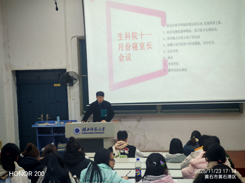 会议伊始,张良老师着重强调了寝室长在学生日常管理中的关键作用,要求全体寝室长以高度的责任感和使命感做好寝室管理工作。张良老师围绕八个方面对寝室管理工作进行了具体部署:一是严格执行归寝管理制度,及时掌握室友动态,发现异常情况第一时间报告;二是坚决杜绝违规电器使用,配合保卫处开展常态化安全检查;三是认真执行周日晚点名制度,确保线上线下同步落实;四是积极组织同学参加体育锻炼,备战体测,坚决杜绝代考行为;五是深入开展反诈宣传教育,提高学生安全防范意识;六是大力宣传征兵政策,鼓励有志青年投身国防建设;七是严肃考风考纪,营造公平公正的考试环境;八是畅通谈心谈话渠道,及时了解学生思想动态与实际困难。