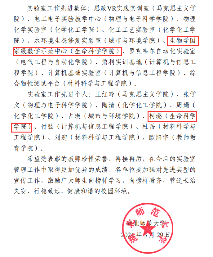 此项荣誉是学校对我院实验教学示范中心实验室工作的充分肯定与认可,更是对未来工作的期盼与勉励。我院将进一步规范与完善各项管理制度,切实提升实验室管理和建设水平,努力提高实验室工作成效,齐心协力推进生物学国家级实验教学示范中心建设与发展。