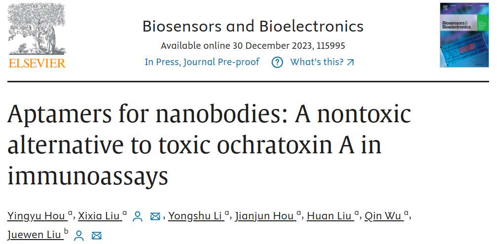 202312月,刘细霞副教授团队与滑铁卢大学刘珏文教授合作在生物学Top期刊《BIOSENSORS & BIOELECTRONICS》(中科院1区,IF: 12.6)发表题为“Aptamers for Nanobodies: a Nontoxic Alternative to Toxic Ochratoxin A in Immunoassays”的研究性论文。2021级硕士研究生侯莹钰为第一作者,通讯作者为刘细霞副教授和滑铁卢大学刘珏文教授。