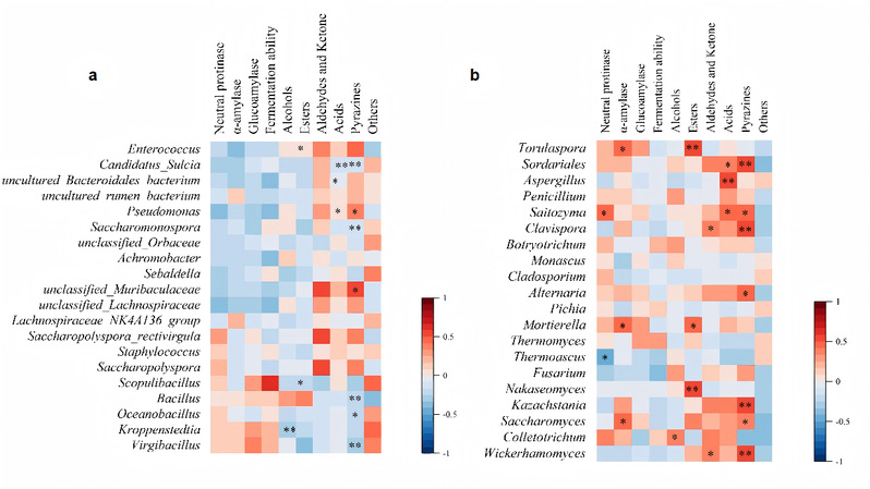 酱香型大曲是酿造酱香型白酒的核心发酵原料,但其发酵中微生物演替、理化变化与风味形成的关联长期不明。团队通过 “高通量测序 - 理化监测 - 挥发性物质分析”,追踪 52 天发酵过程,发现发酵温度呈 “快速升温 - 波动平台 - 缓慢降温” 三阶段,高温促芽孢杆菌、热子囊菌等耐热微生物富集,其产生的水解酶可降解淀粉、蛋白质为风味前体物质。研究还明确,细菌群落变化大于真菌,厚壁菌门、子囊菌门为主导;前期还原糖、酸度、水分,后期氨基酸态氮驱动群落演替,且丝状真菌、芽孢杆菌与关键风味物质吡嗪类紧密相关。该成果建立 “微生物 - 理化 - 风味” 关联模型,为大曲生产标准化、白酒品质提升提供支撑。本研究得到湖北省重点研发计划项目(2022BCE006)、湖北省高校优秀中青年科技创新团队计划项目(T2022028)和中央引导地方科技发展资金(实验室重大科技成果转化)项目(2024BSB020)的资助。(审核 李刚华